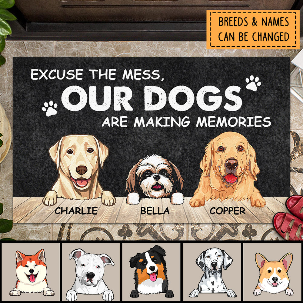 Excuse The Mess Our Dog Is Making Memories, Black Doormat, Personalized Dog Breeds Doormat, Dog Lovers Gifts