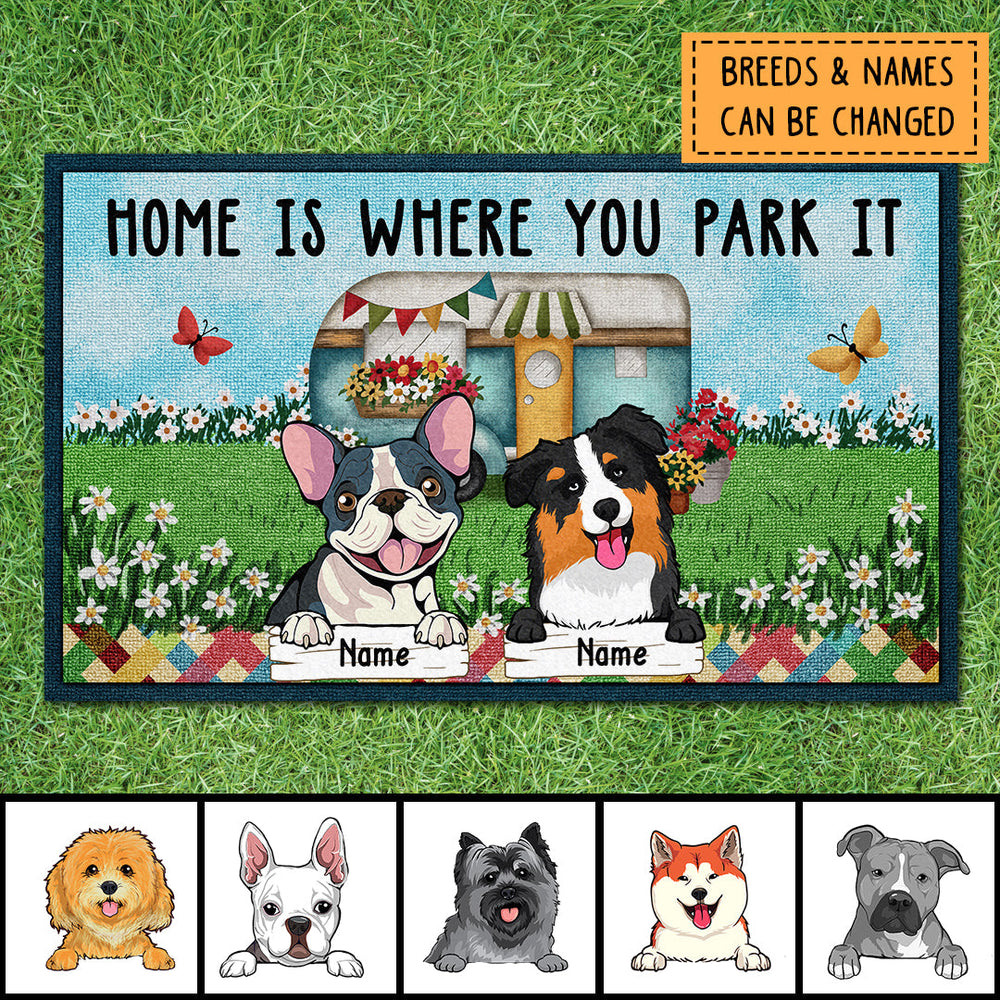 Home Is Where You Park It, Camper Vans On The Green Field With Flowers And Butterflies, Personalized Dog Lovers Doormat