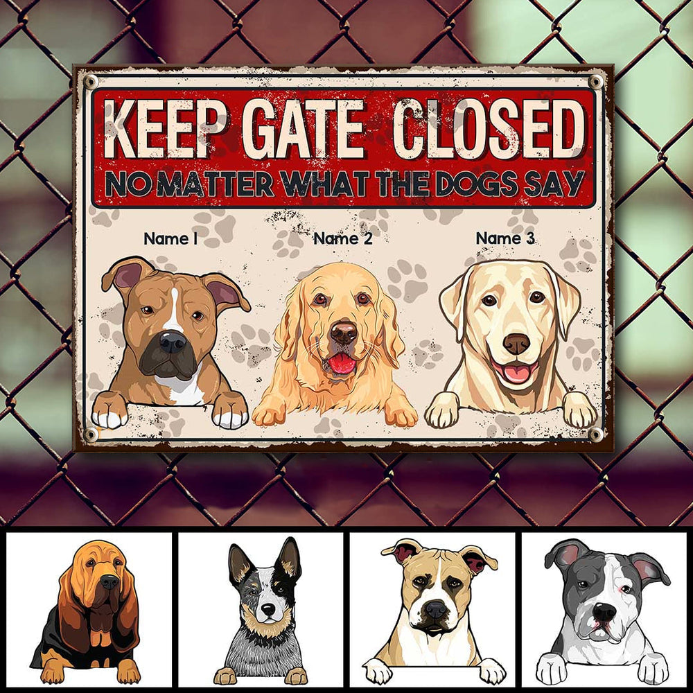 Keep Gate Closed No Matter What The Dogs Say, Pawprints Sign, Personalized Dog Breeds Metal Sign, Outdoor Decor