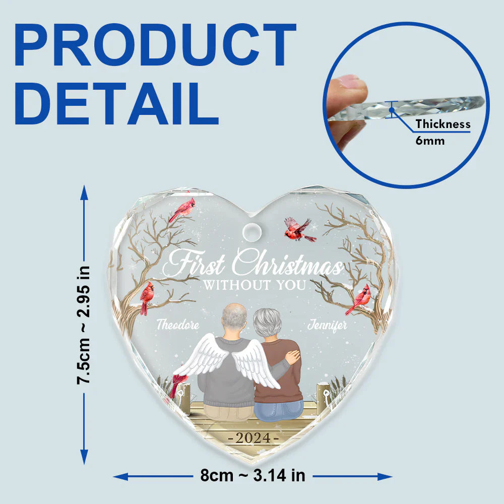 Cherish precious memories with the First Christmas Without You Memorial - Personalized Heart Shaped Glass Ornament. This sentimental piece serves as a heartfelt reminder for those navigating the emotions of loss during the holiday season. It makes a unique and thoughtful gift for couples, old couples, husbands, wives, moms, dads, boyfriends, and girlfriends on Valentine's Day, Mother's Day, Father's Day, Thanksgiving, Christmas, birthdays, and anniversaries.