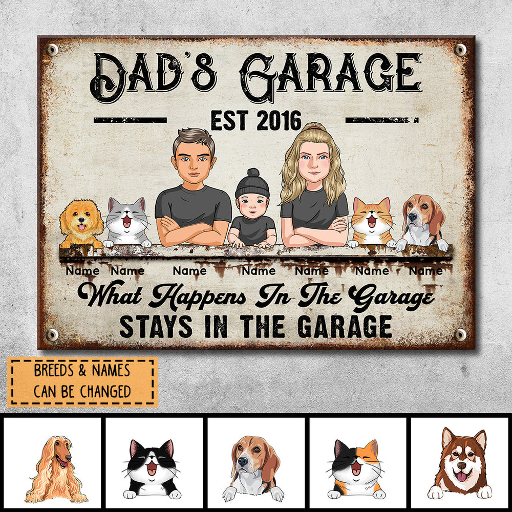 Welcome Metal Garage Sign, Gifts For Pet Lovers, Dad's Garage What Happens In The Garage Stays In Vintage Style