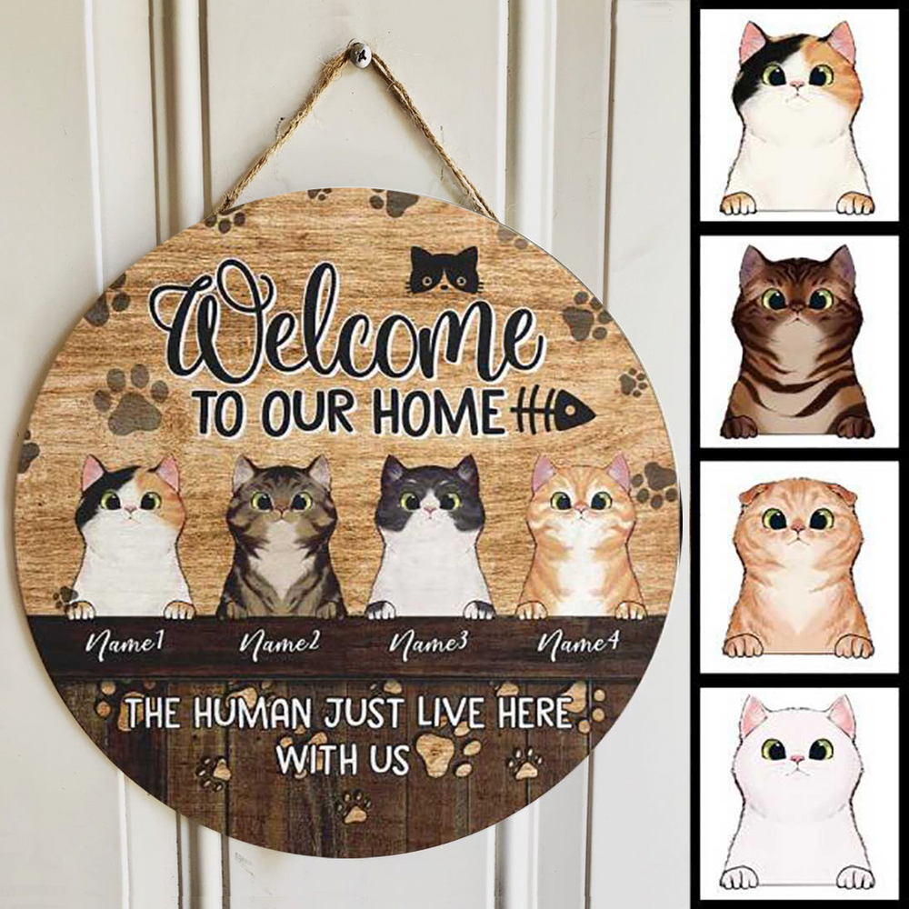 Welcome To Our Home - Personalized Cat On Wooden Door Sign