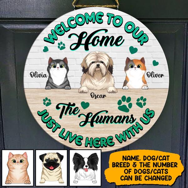 Welcome To Our Home, The Humans Just Live Here With Us - Personalized Wooden Door Sign