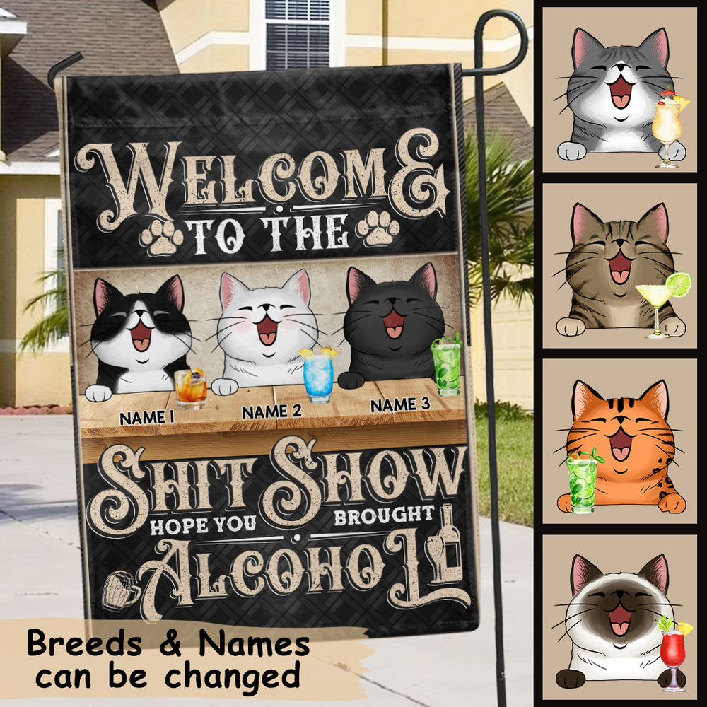 Welcome To The Shitshow Hope You Brought Alcohol, Black Background, Personalized Cat Breeds Garden Flag